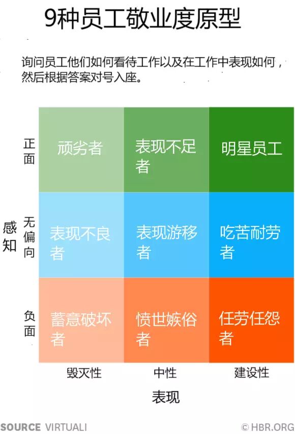 通过比对认知和行为,Virtuali提出了9种员工敬业度模型: