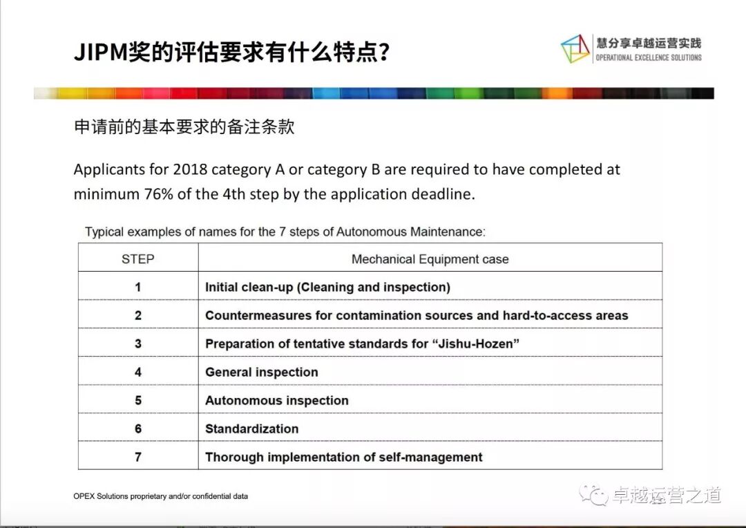 在申请JIPM的要求中,有一个看上去比较“严苛”的条款,就是自主管理的推进必须要达到第四步,而远期目标是100%的设备,近期的目标是76%。熟悉自主管理要求的小伙伴可能知道这个的难度和意义。