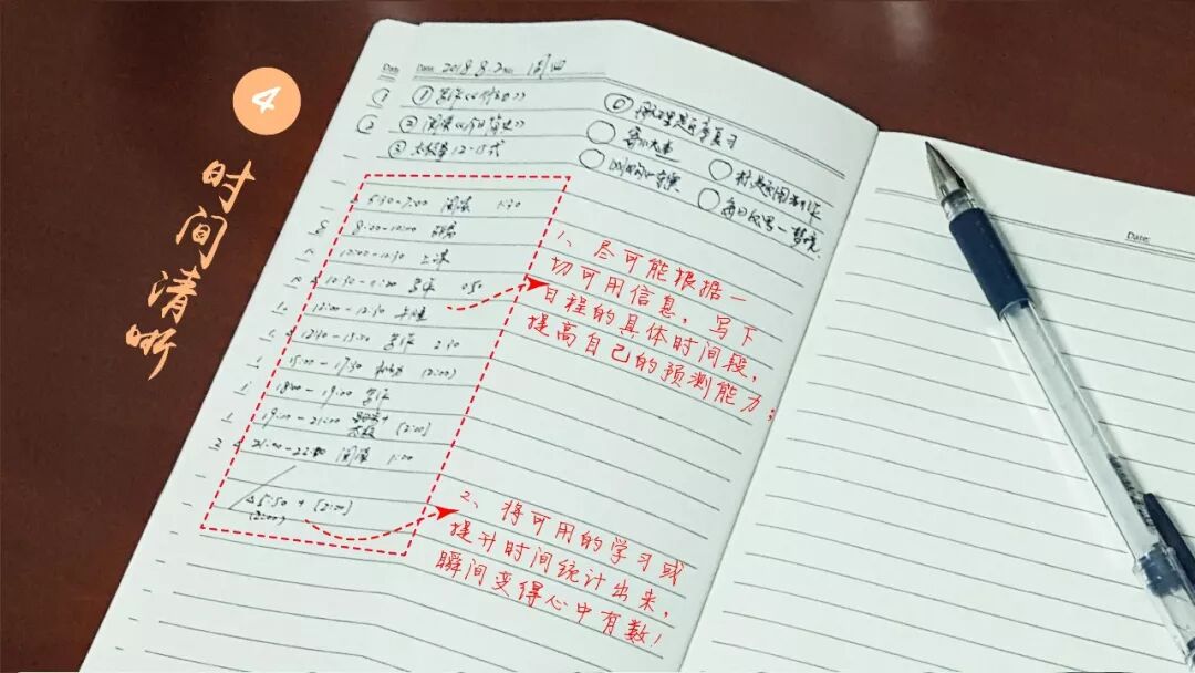 Step4:收集一切可用信息,在左侧预测性地写下几点到几点做什么,然后在底部统计出可用的学习提升时间,时间瞬间也变得清晰了。